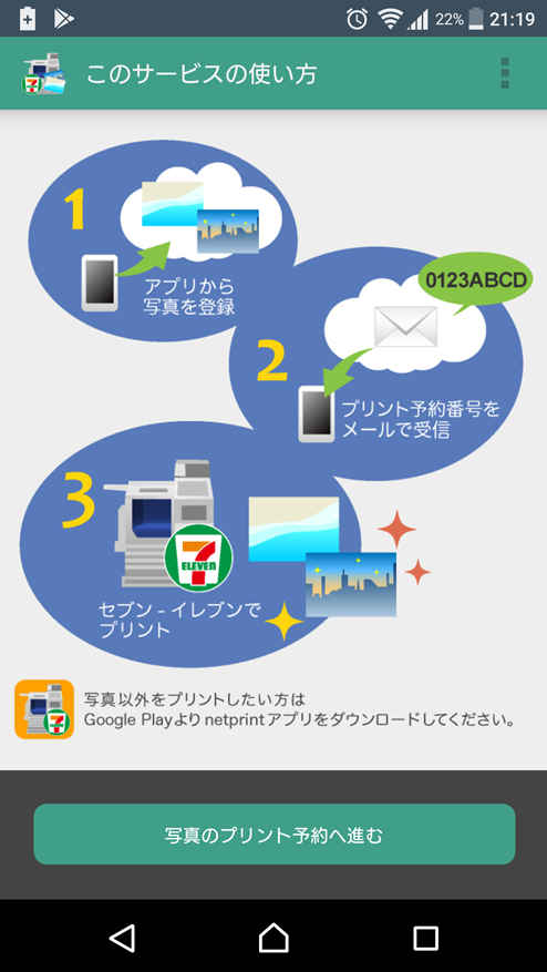 ②インストール完了したらアプリを起動し「写真のプリント予約へ進む」をタップします。