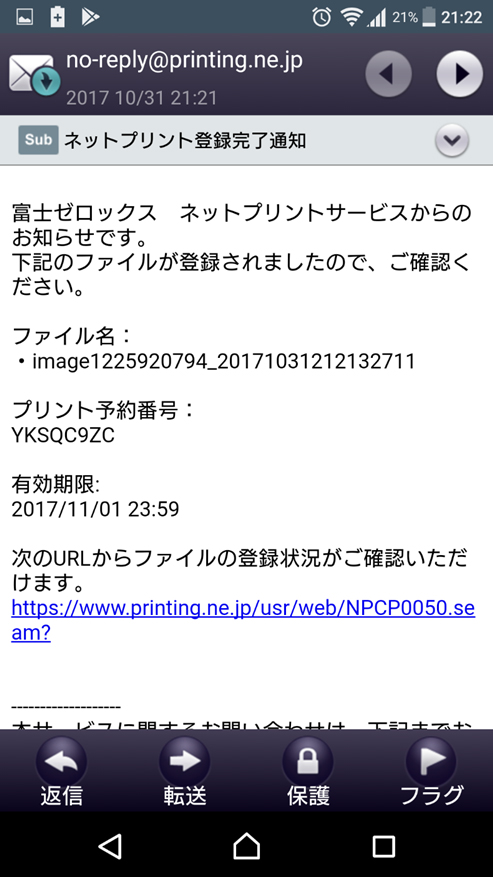 ⑧登録したメールアドレスにも「ネットプリント登録完了通知が届きます。アプリの予約完了画面のスクショを取り損ねた場合でも安心です☆