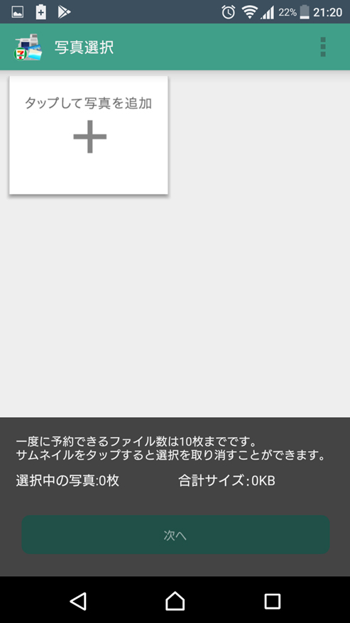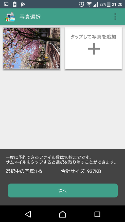 ③「タップして写真を追加」でプリントしたい写真を選択し、選び終わったら「次へ」をタップします。最終的に写真は10枚、4MBまで登録できますが、一括して10枚登録できるわけではありませんので、1枚ずつ追加する作業を繰り返すことになります。
