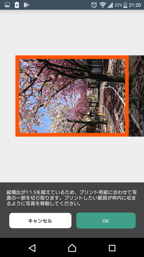④写真の縦横比が基準に合わない場合、自動的にトリミングの案内が出てきますので、プリントしたい部分が枠内に収まるように移動します。