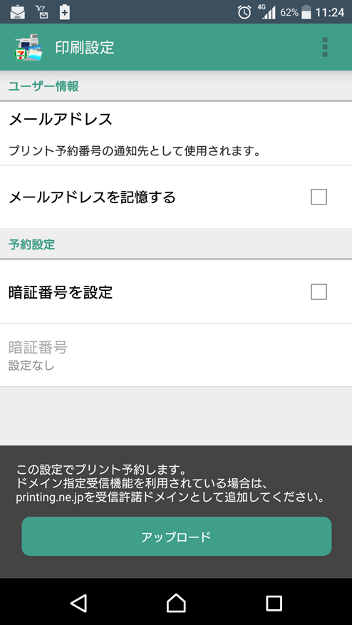 ⑥次はメールアドレスと暗証番号の入力画面になります。暗証番号の設定は任意なのでしなくても大丈夫ですが、メールアドレスは必須項目で、入力しないと次の操作に進めません。